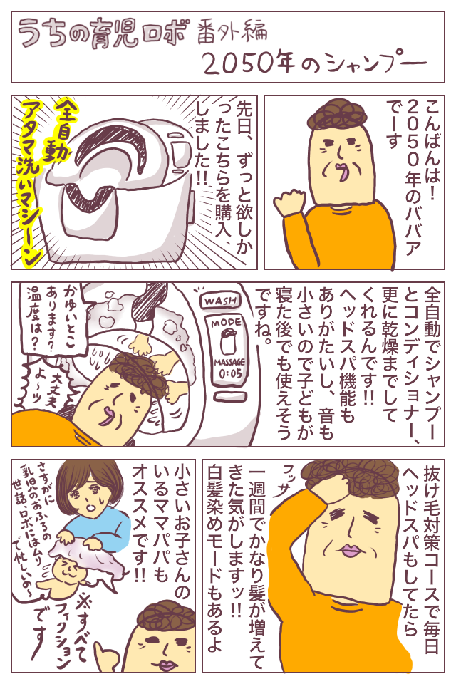 2050年、入浴介助ロボなどは当たり前になっているでしょうけれども、暴れまわる乳幼児のお風呂の介助は難しそう。