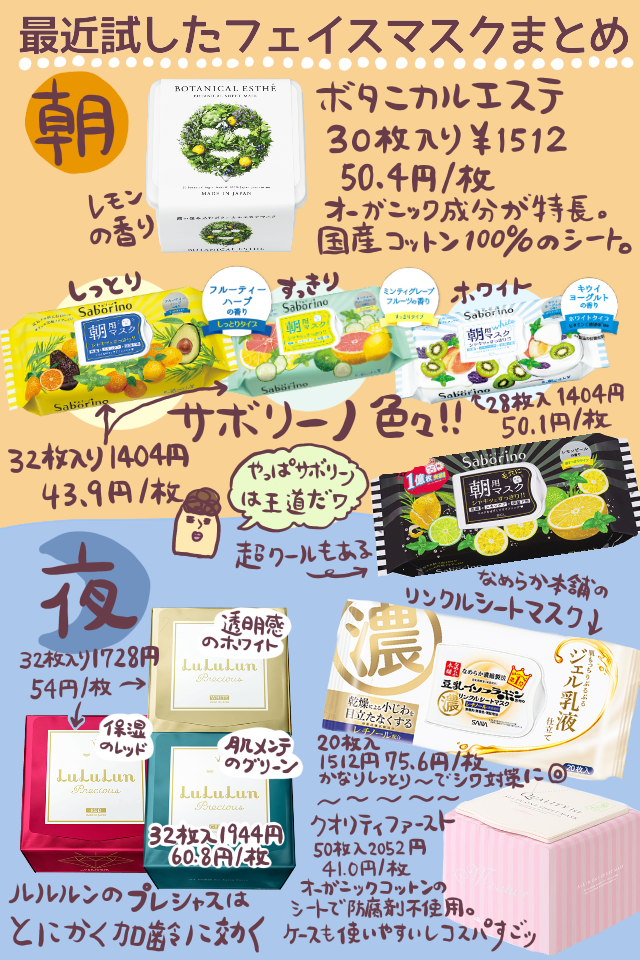あれからず〜〜っと色んなフェイスマスクを朝晩試し続けたので、1枚にまとめてみましたッ!!!自分の振り返りのために…。そして、皆様のフェイスマスク選びのお役にも立てたら嬉しいですわっ…。いや、大したことは書いてませんが。