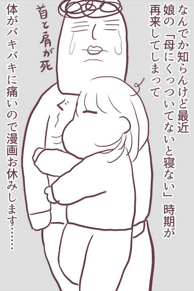 顎まわりが娘の髪で蒸れまくり、寝不足も相まってやたらと顎にニキビができていました…。もちろん首と肩も激痛で。
