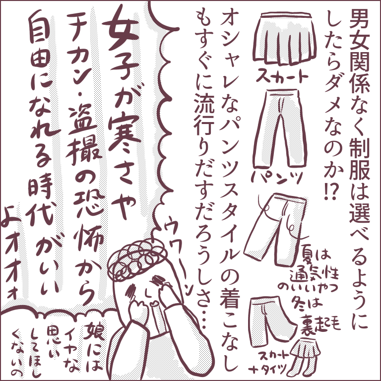 そして、逆に男子の制服は嫌だと思っている男子もいるかもしれないし。トランスジェンダーの子だっているだろうし。