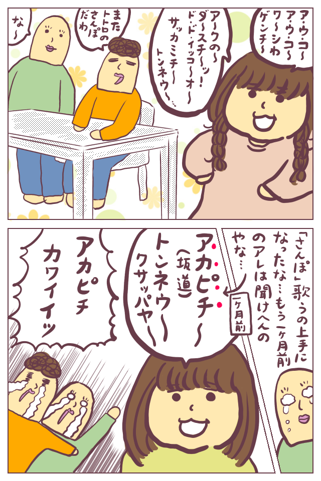 娘、妙に歌をよく歌っていて…。最初はうまく言えなかった歌詞がどんどんうまくなっていくのを見ると、嬉しいやら寂しいやらです。