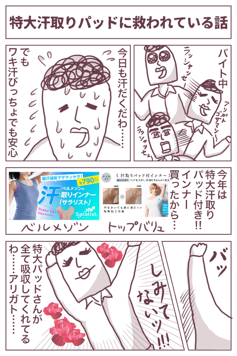【汗取りインナー】特大パッド、ありがとう 2018年07月28日 ひぃ〜〜〜もう23時になってしまう〜〜夜ってすぐ過ぎてしまいますね。特に休みの日の夜!!悲しい…今日は特大汗取りパッド付きのインナーを導入した話です。汗取りインナー サラリスト・綿100% フレンチ袖[ 吸水速乾 ・ 消臭 ] ベルメゾン ◆ S M L LL 3L ◆◇ レディー ... 続きを読む