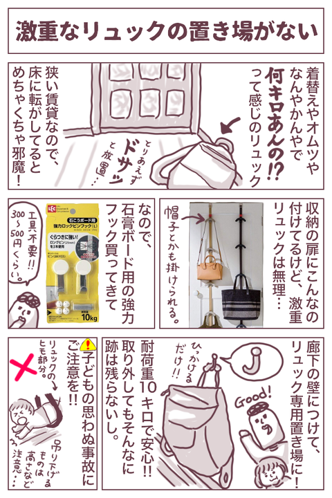【片付け】激重リュックの置き場 2018年07月08日 子どもがいない頃はカバンなんて財布とケータイとポーチが入ればよかったけど、今はそうもいかない。着替え、オムツ、おしりふき、ウエットティッシュ、おやつ、ハンドタオル、母子手帳、日焼け止め、虫除けスプレー、etc...着替えとかはもう要らないかなぁ…と思っていたの ... 続きを読む
