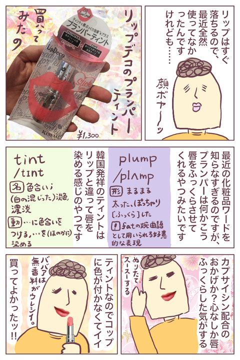 【化粧品】唇ふっくら、プランパーティント 2018年08月20日 最近買ってよかった〜〜と思ったプチプラコスメの話ですッ!!!!めちゃくちゃ簡単にササ〜っと描いたので、1枚だけ。ティントは前から知っていましたが、プランパーって何…??ということで無駄に辞書を引きました…。リップデコさんのサイトはこちら。https://www.isehan ... 続きを読む