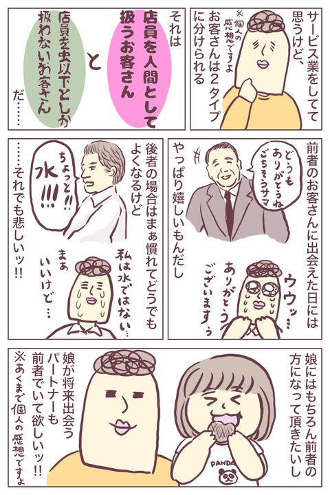 【日記】サービス業してて思うこと / 娘の好きなヨーグルト 2018年08月21日 最初に書いておきますが※あくまで個人の感想です今日はこんな話です。※3コマ目と4コマ目で男性の絵を描きましたが、女性でも同じことはあります。とりとめのない漫画になってしまいました。バイトしているとこんなことを感じます……。接客は昔よくやっていましたが、久し ... 続きを読む