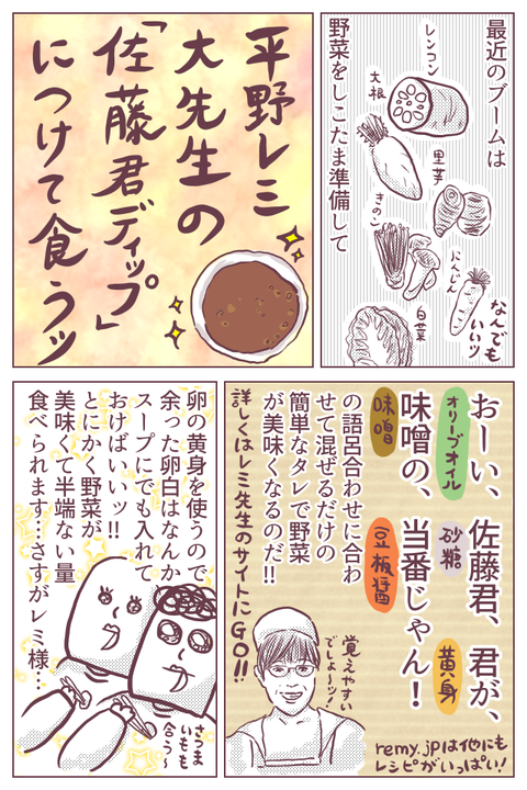 レミ先生のレシピ 2018年12月06日 こんばんは。今日は雨のせいか、ババアは偏頭痛でぼちぼちの1日でした…。皆様はいかがお過ごしでしたか?今日は、野菜が山盛り食べられるあのレシピについてです。平野レミ先生の、「佐藤君ディップ」のレシピはこちら!!↓決定版!野菜スティックにつけたいディップ4選 他 ... 続きを読む