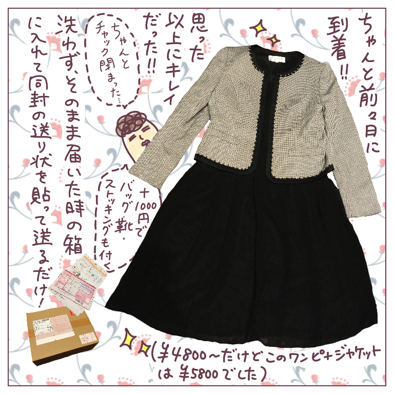 今回はバッグやストッキング、靴類は自前で済ませたので追加の物品はナシ。スーツ代5800円+あんしんパック1000円の合計6800円でした。