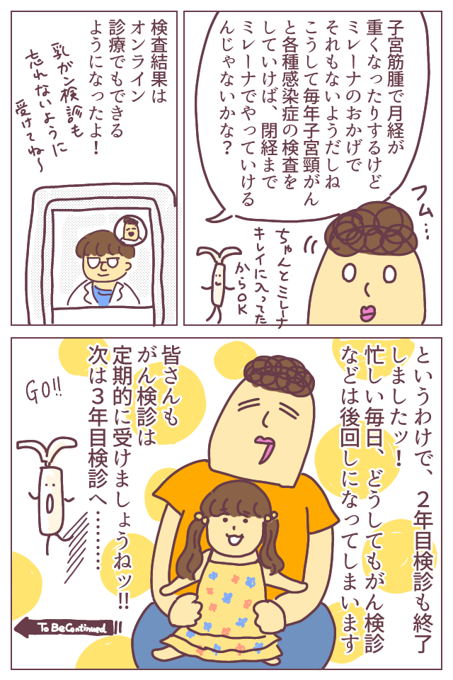 ミレーナのおかげで、やっぱりちゃんと婦人系のガンの検査を受けるきっかけができていると感じます!!!これも大きな効果。