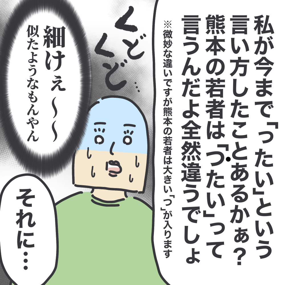 熊本県民の妻を持つ夫がよく怒られること 2023年03月13日 こんばんは。熊本県民の妻を持つ夫がよく怒られることそれは、散歩をしていたある日のこと。少し先で、子どもの泣く声がした。熊本では「転ぶ」は「つこける」。なかなか私がこちらで熊本を話さないので夫の熊本弁スキルは上がらない……(ちなみに「じゃああの方は熊本じゃなくてどこの方言だったん!?」と言われたらそれはそれで自信がないという……ーーーーーーーーーー今日も今日とて時間がなく、短い更新で失礼いたします!!今夜も暖かくしておやすみくださいね。おわり。 「熊本弁の話」カテゴリの最新記事 < 前の記事次の記事 > コメント コメント一覧 (6) 1. ぽん 2023年03月26日 13:55 福岡、佐賀、長崎あたり〜? 0 baba_ikuji がしました 4. ババア 2023年04月18日 22:26 >>1 コメントありがとうございます〜!! (遅い返事ですみません… ですね、その辺りな感じしますよね😁!? 0 baba_ikuji がしました 2. うっきょん。 2023年03月26日 22:40 こんばんは! LINEの通知で来た一覧(?)からお邪魔しました(*^^*) 私も熊本出身(市内と阿蘇の真ん中辺りです(*^_^*))なので、すんごい親近感w私が言うなら、「そぎゃんふざけて歩くけん、つこくったい!」辺りでしょうか…^^;←人生の半分以上を関東で過ごしてしまっているので、熊本感薄まってるかも^^;なのに未だに実家から醤油、五木のうどん、うまかっちゃんは仕送りしてもらってます(´>∀<`)ゝ そして、お子さんのご卒園・ご入学おめでとうございます(^^) 0 baba_ikuji がしました 5. ババア 2023年04月18日 22:28 >>2 コメントありがとうございます〜!! (遅い返事ですみません… 熊本感しっかりありますよ〜!!「つこくったい!」「つこくっつたい!」「つこくっとたい!」このへんのニュアンス、私は最近自信がなくなってきました😁どんな感じで喋ってたかなあ〜〜と。。 関東ですと、あまり方言自体を聞くことがないですかね??私は関西なので関西弁に影響されつつあり…って感じです。 ご実家からお醤油送っていただいてるんですね〜!!やっぱり甘めのやつでしょうか?? 私も次の帰省の時にいろいろ仕入れて帰ろうと思います✨ 0 baba_ikuji がしました 3. tommy 2023年03月27日 00:53 ご飯の友の時にコメントしました熊本生まれ熊本育ちです😅 私だったら、そぎゃんふざくっけんつこくっつたいって言ってしまいそうです😅 0 baba_ikuji がしました 6. ババア 2023年04月18日 22:29 >>3 コメントありがとうございます〜!! (遅い返事ですみません… 「そぎゃん」「そがん」この使い分けが分からなくなってきました、熊本離れて数年目です😂どうでしょう??私はどっちを使ってたっけ!?と最近不安です😂 また見ていただいてありがとうございます✨ 0 baba_ikuji がしました コメントフォーム 名前 コメント 記事の評価 リセット リセット 顔 星 情報を記憶 コメントを投稿する