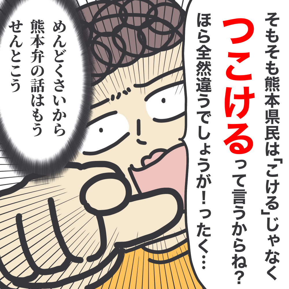私も熊本出身(市内と阿蘇の真ん中辺りです(*^_^*))なので、すんごい親近感w私が言うなら、「そぎゃんふざけて歩くけん、つこくったい!」辺りでしょうか…^^;←人生の半分以上を関東で過ごしてしまっているので、熊本感薄まってるかも^^;なのに未だに実家から醤油、五木のうどん、うまかっちゃんは仕送りしてもらってます(´>∀<`)ゝ