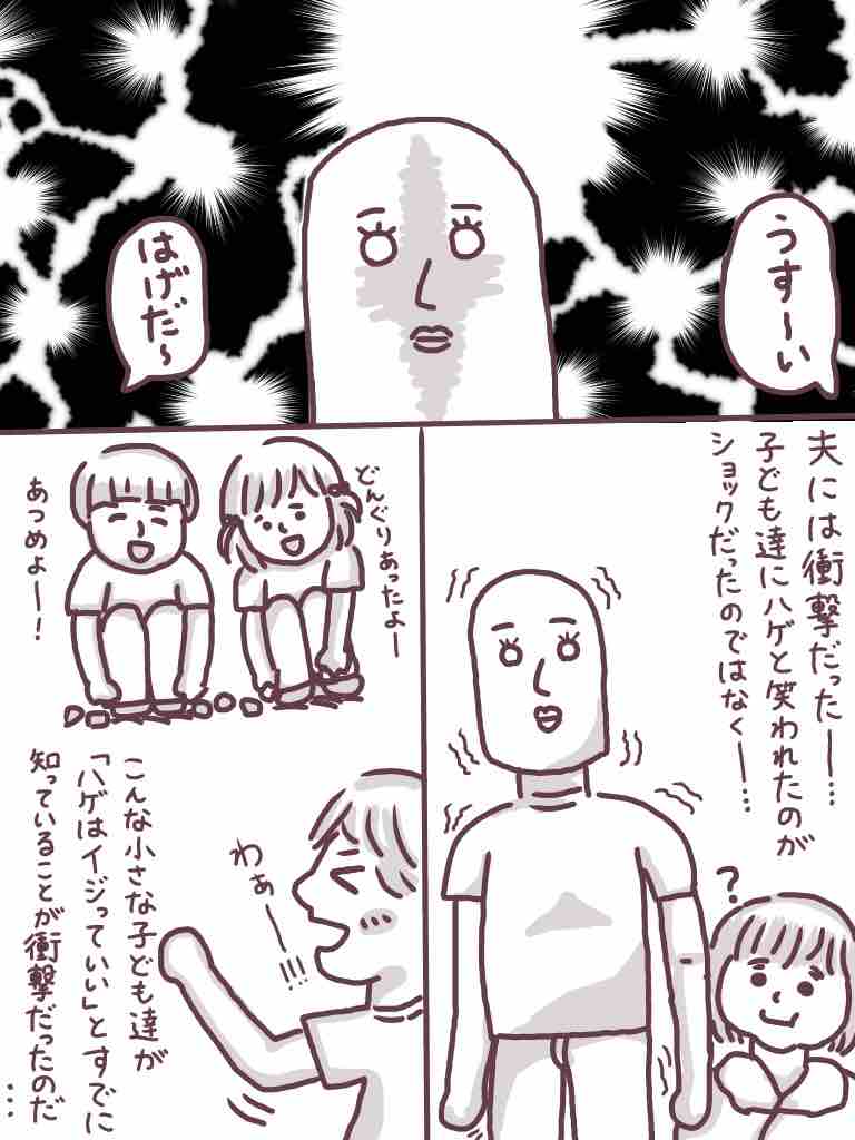 夫はもう髪が薄くなってからだいぶ経つので、今回のことについては「ハゲを笑われた」ことが悲しかったのではなく「こんな小さい子どもさえハゲをイジるのか!?」ということが衝撃だったのです。